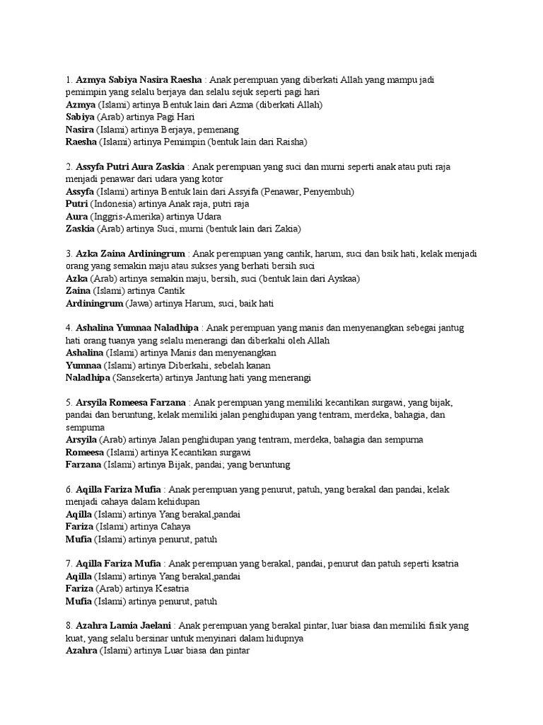 Kumpulan arti nama bayi perempuan Islam ini bisa sekaligus dijadikan doa bagi para orang tua kepada sang anak. Safiya Munira Zafina Zoraida Raniyah. Anak perempuan yang kaya bersinar dan gemilang.